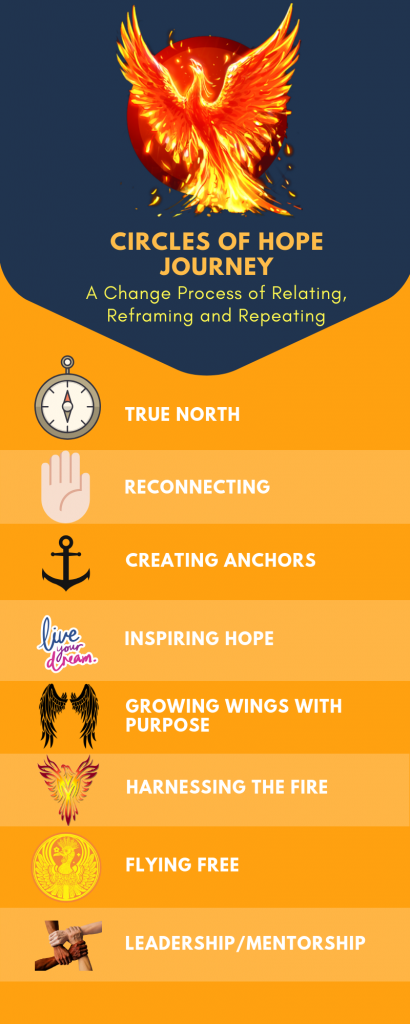The Circles aim to create self- awareness and ownership of choices, building meaningful relationships and team dynamics,  collaborative communication and listening skills, reframing negative perceptions and self-talk, healthy boundaries, rebuilding a value system, building trust, forgiveness and letting go, finding  purpose, finding  alignment and inspiration, building the habits to be sustainable, getting into flow, expanding their leadership attributes, and becoming an effective mentor.